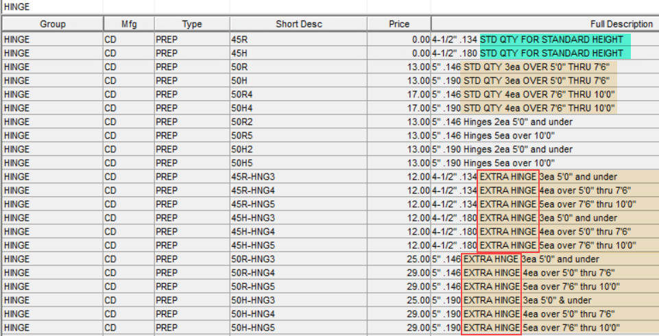 In order to price and prep doors and frames properly for extra hinges a prep description indicated “EXTRA HINGE” must be selected.