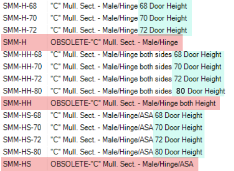 SMM hinge mullion components have been rebuilt with door sizes as the original components did not allow for a size to be entered. Original components have been indicated as OBSOLETE