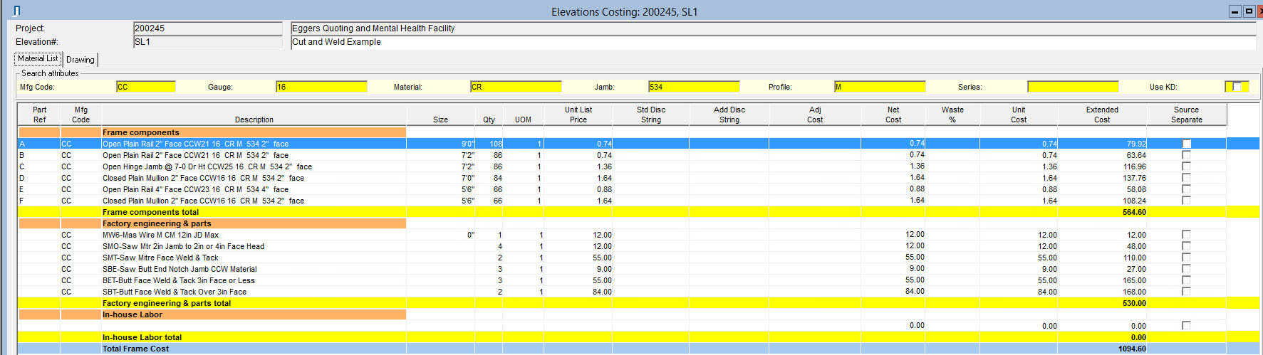 Adjusted cost and when necessary split cost of combined cut and weld labor for elevations