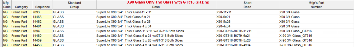 Partial Update 4/18/20 Fix L-FRA100 with X90 Glass and GT116 glazing. Fix X90 glass with and without GT116 glazing