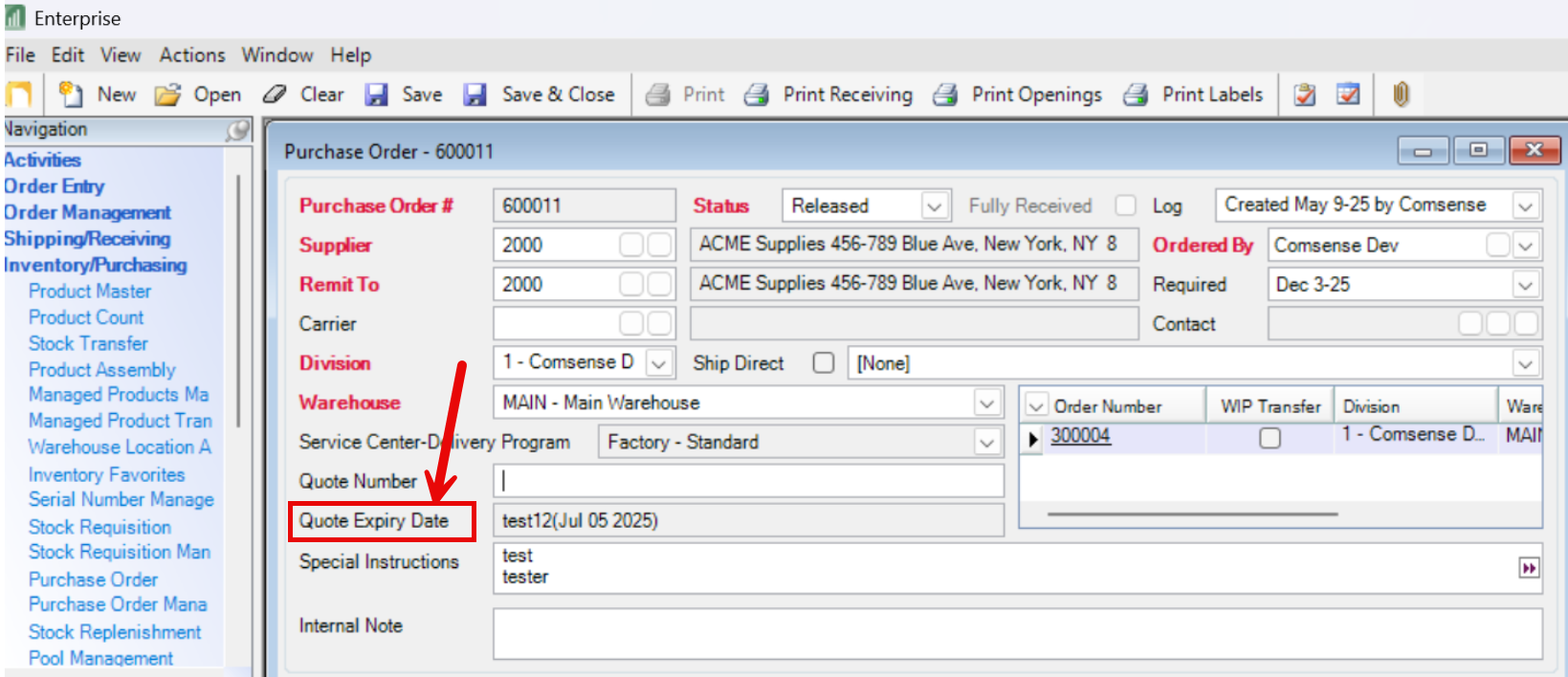 Quote Expiry Date is also displayed in the Purchase Order window as a read-only field and cannot be edited.