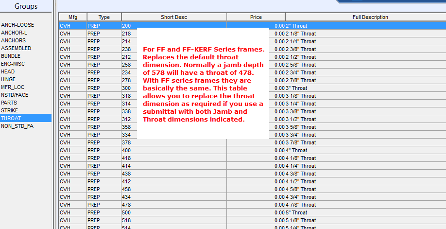 Additionally, if a Submittal is used that displays jamb depth and throat dimension the throat dimension will be 1″ less the the jamb depth as a default. There is a table of records called THROAT where you can manually assign the throat dimension to match the jamb depth for this series frame. See sample of this table below