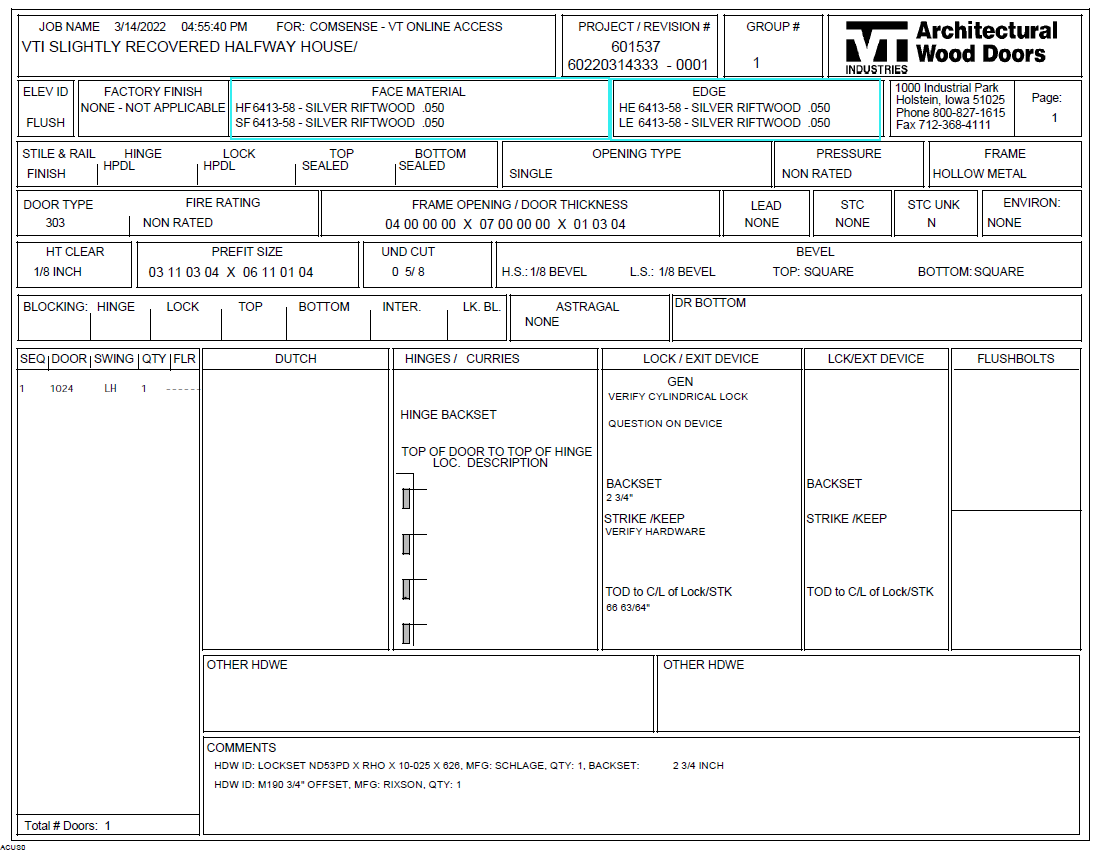 Test after addition of new laminate was successful per returned Door Details Order Acknowledgement.